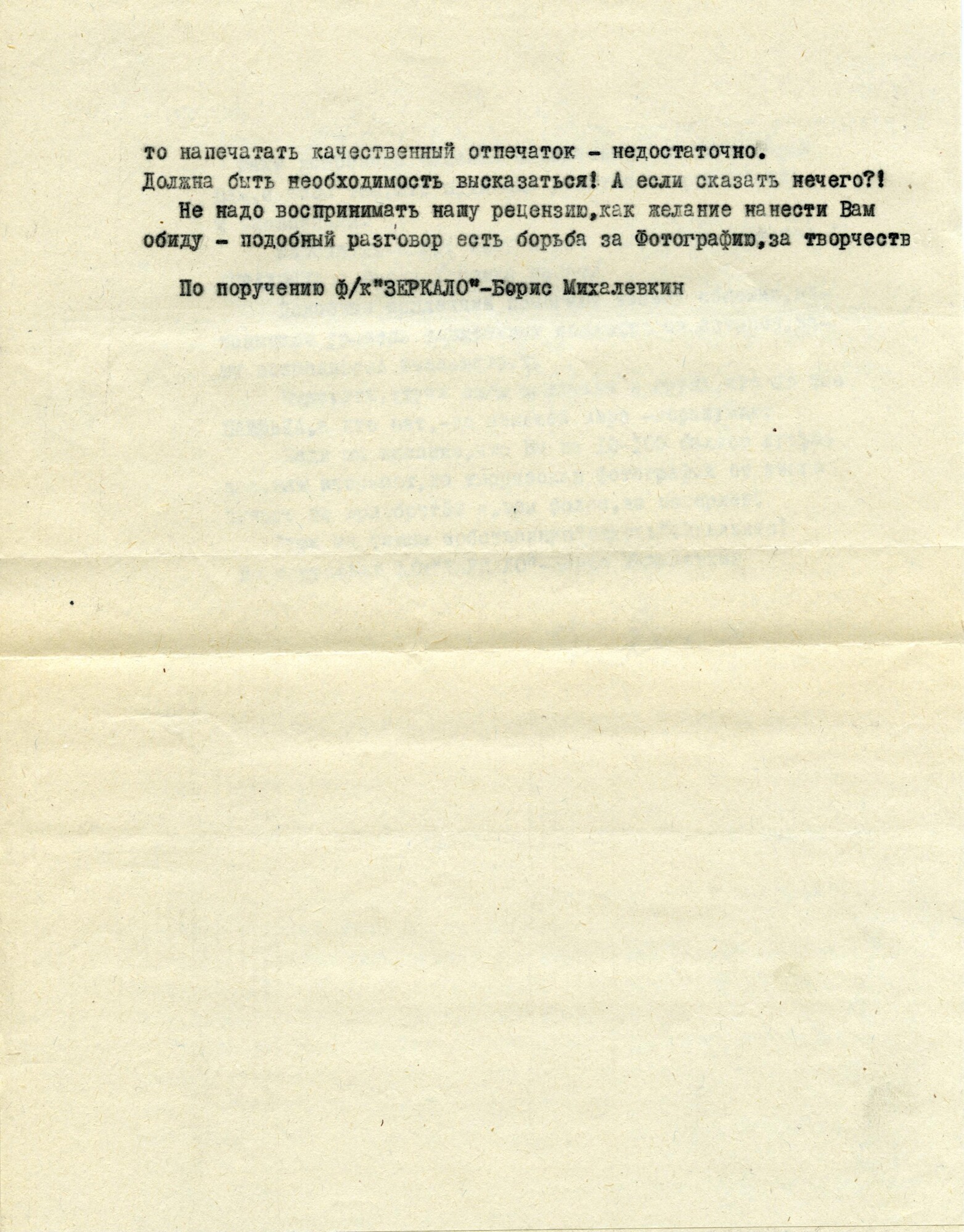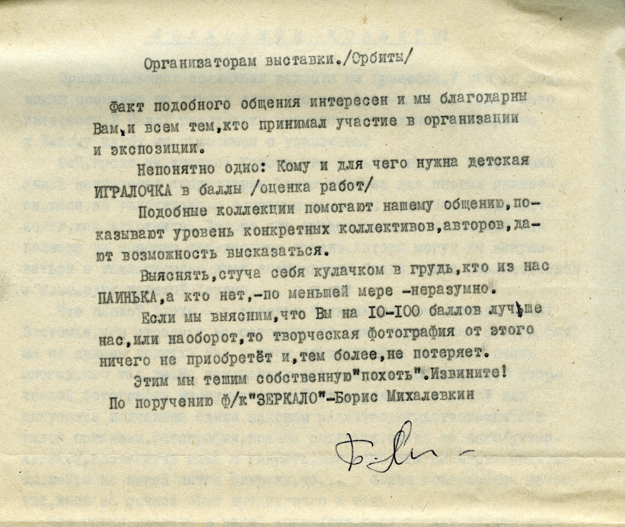 Название экспозиции отсылает к персональным выставкам автора, которые он незатейливо именовал «Борис Михалевкин. Фотографии». Такое название не просто демонстрировало авторскую убежденность в том, что все сделанное и отобранное им достойно внимания зрителя, но и уверенность в своей способности видеть мир уникально, не таким, как его видят другие. Каждая такая выставка представляла собой подборку избранных работ из постоянно пополняющегося авторского архива. Сегодня пришло время сторонних, свободных от авторского видения интерпретаций, позволяющих выделять лучшее ―самое ценное для постоянно сменяющихся поколений зрителей.